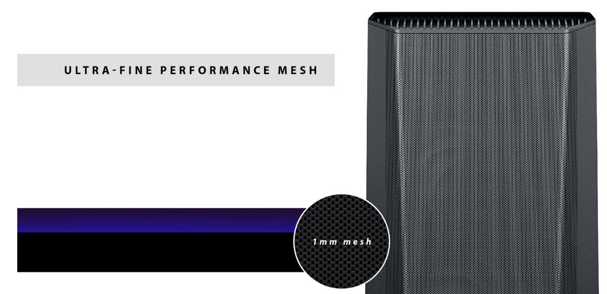 Increase air intake with enlarged mesh surface area A seamless front panel design with ultra-fine perforations Minimize flow resistance with integrated dust filter.